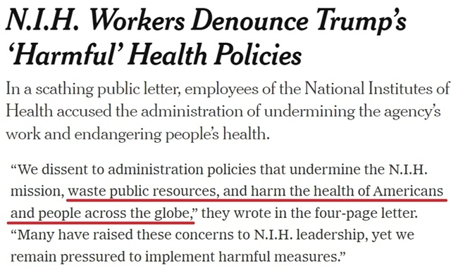 近日,NIH近百名現(xiàn)任和新近被解職的職員發(fā)表聯(lián)名信,批評美國現(xiàn)政府“有害”的衛(wèi)生政策危害美國和全球人民的健康,將科學(xué)研究政治化并浪費(fèi)公共資源。