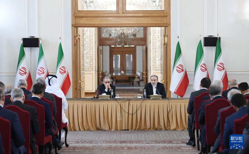 10月5日,在伊朗首都德黑蘭,伊朗外交部長(zhǎng)阿拉格齊(右)對(duì)多國(guó)駐伊朗外交人員發(fā)表講話。新華社記者 沙達(dá)提 攝