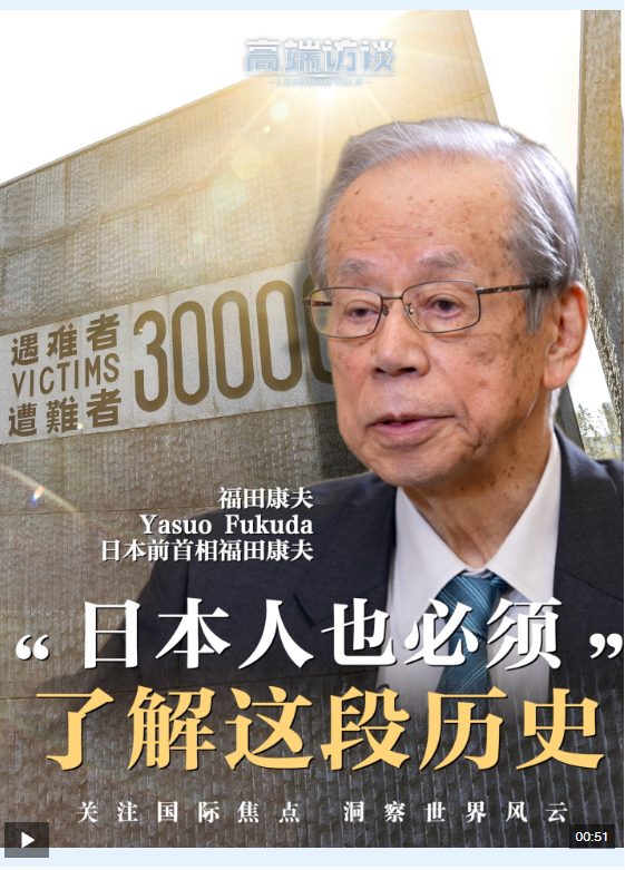 日本前首相福田康夫曾在2018年參觀侵華日軍南京大屠殺遇難同胞紀念館,他是第四位參觀的日本前首相。接受總臺《高端訪談》專訪時,他說,日本人也必須了解這段歷史。