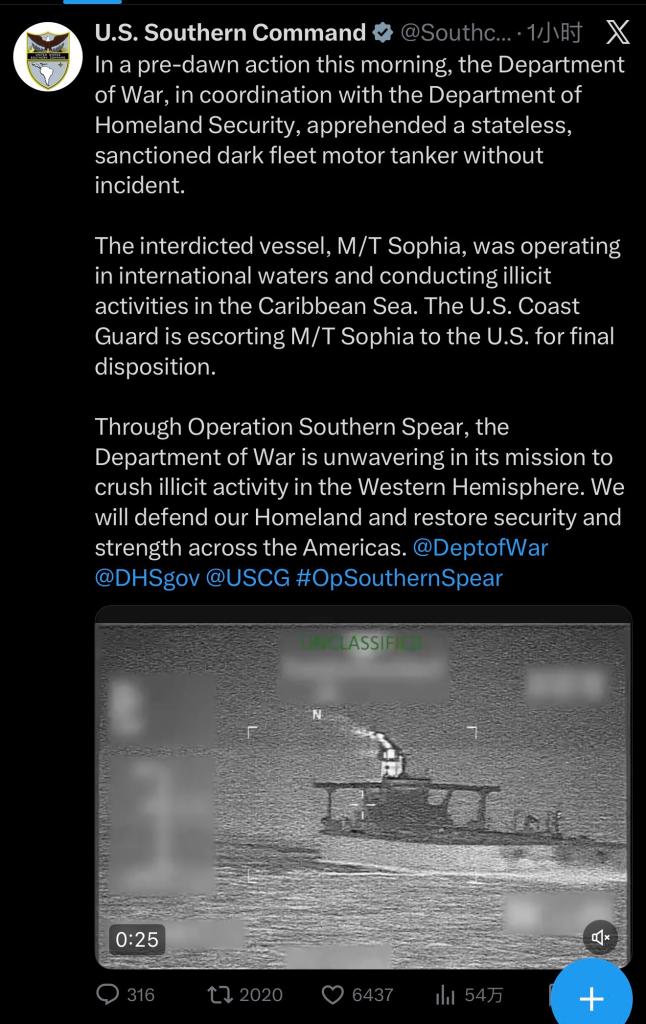 此外,美國南方司令部7日在社交媒體發(fā)布消息稱,美國當(dāng)天凌晨攔截“一艘無國籍、受制裁的‘影子艦隊(duì)’油輪”,行動(dòng)過程中未發(fā)生任何意外。該船名為“索菲亞”號(hào),當(dāng)時(shí)正在國際水域航行。美國海岸警衛(wèi)隊(duì)正在控制“索菲亞”號(hào)前往美國進(jìn)行處置。據(jù)路透社消息,這艘船1月早些時(shí)候從委內(nèi)瑞拉駛離。(記者:馬驍、湯潔峰)