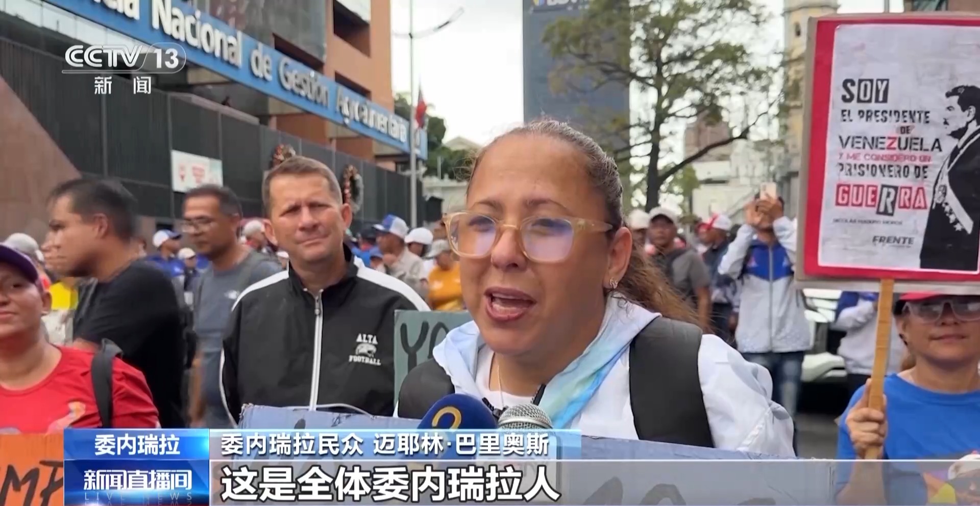 參與游行的民眾手持標(biāo)語、齊喊口號,強(qiáng)烈譴責(zé)美國強(qiáng)行控制總統(tǒng)馬杜羅,并呼吁為捍衛(wèi)國家尊嚴(yán)而奮斗。