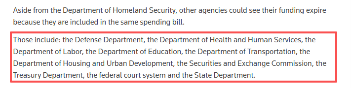 據(jù)路透社報(bào)道,美國(guó)國(guó)會(huì)每年需為438個(gè)聯(lián)邦機(jī)構(gòu)撥款,若未能履行該職責(zé),相關(guān)機(jī)構(gòu)必須停止所有非必要工作。此次部分“停擺”涉及多個(gè)關(guān)鍵部門,包括美國(guó)衛(wèi)生與公眾服務(wù)部、交通部、證券交易委員會(huì)、財(cái)政部、聯(lián)邦法院系統(tǒng)等。