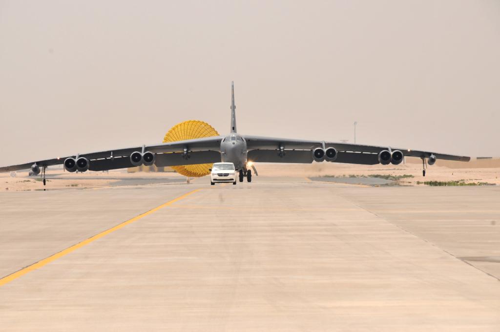 這張資料照片顯示的是2016年4月9日,一架美國空軍的B-52轟炸機抵達卡塔爾烏代德空軍基地。新華社/美聯(lián)
