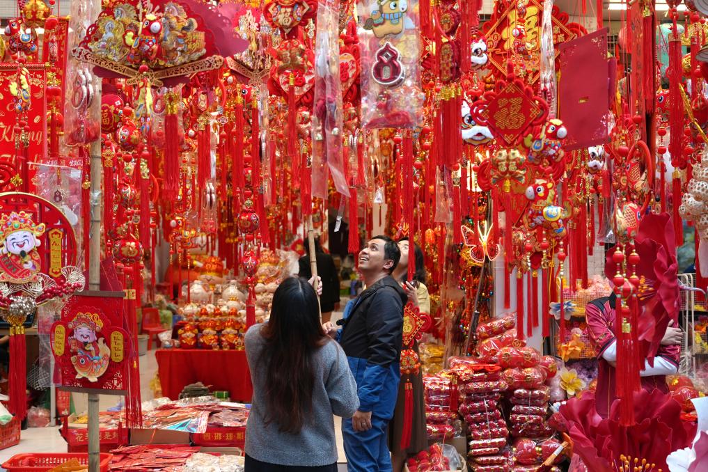 2月13日,顧客在越南首都河內(nèi)的馬市街選購新春飾品。新華社記者 劉潁 攝
