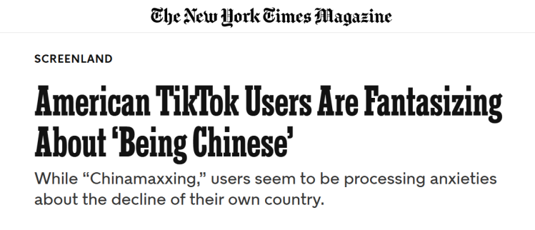 美國《紐約時(shí)報(bào)》日前刊文稱,“Becoming Chinese”(“成為中國人”)“Chinamaxxing”(“極致中國化”)等話題在海外社交媒體上火爆異常,大量網(wǎng)友模仿并表示自己愛上了中國人的生活方式。文章認(rèn)為,電動汽車、醫(yī)療保障、高速鐵路,這些先進(jìn)事物逐漸揭開了中國生活的神秘面紗,也讓中國成為新一代旅游勝地——一個(gè)兼具超凡脫俗的自然風(fēng)光與現(xiàn)代科技的神奇的地方。在“極致中國化”體驗(yàn)過程中,西方網(wǎng)友們似乎在消化對本國衰落的焦慮情緒,美國民眾們仿佛能從這些視頻片段中看到一種尚未在本土實(shí)現(xiàn)的未來圖景,在他們看來,中國人高品質(zhì)、低成本的生活,穿著拖鞋、滋養(yǎng)脾胃的日常,應(yīng)是人人都能享有的生活常態(tài)。