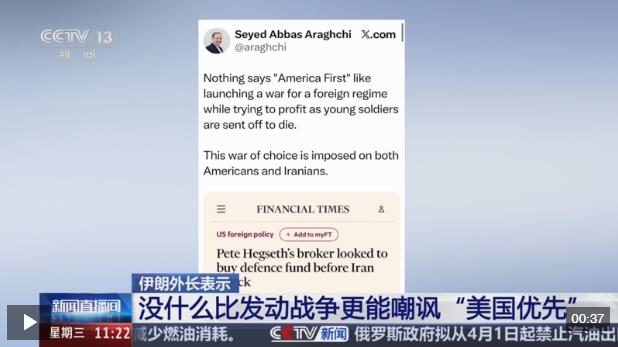對(duì)于美國國防部長(zhǎng)赫格塞思的投資經(jīng)紀(jì)人曾在美以對(duì)伊朗發(fā)起軍事打擊前,嘗試投資防務(wù)類基金一事,伊朗外交部長(zhǎng)阿拉格齊3月31日在社交媒體發(fā)文說,沒有什么比為一個(gè)外國政權(quán)發(fā)動(dòng)戰(zhàn)爭(zhēng)、并從被派往前線的年輕士兵之死中牟取暴利,更能嘲諷“美國優(yōu)先”口號(hào)的了。