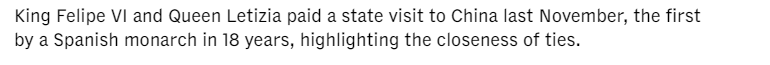 西班牙首相桑切斯4月11日至15日對(duì)中國(guó)進(jìn)行正式訪問(wèn)。此訪是桑切斯四年內(nèi)第四次訪華。多家外媒都予以關(guān)注和報(bào)道。亞洲新聞臺(tái)的報(bào)道說(shuō),去年11月,西班牙國(guó)王費(fèi)利佩六世對(duì)中國(guó)進(jìn)行了國(guó)事訪問(wèn),這是西班牙國(guó)王時(shí)隔18年再次訪華,凸顯了兩國(guó)關(guān)系的密切性。