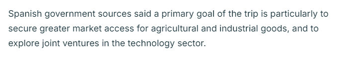法國(guó)24新聞臺(tái)的報(bào)道認(rèn)為,桑切斯希望通過(guò)此訪將西班牙定位為中國(guó)與歐盟27個(gè)成員國(guó)之間的重要橋梁。報(bào)道援引西班牙政府消息人士的話稱,此訪的主要目標(biāo)是擴(kuò)大經(jīng)貿(mào)合作,尤其是在農(nóng)產(chǎn)品、工業(yè)品方面,并探索雙方在技術(shù)領(lǐng)域的合作。同時(shí),西班牙還將利用此次訪問(wèn)為歐元區(qū)第四大經(jīng)濟(jì)體吸引新的投資。