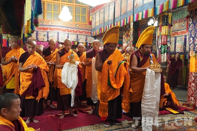 當(dāng)天清晨,扎什倫布寺桑煙繚繞、法號聲聲,28 位受戒的年輕僧人帶著新制袈裟,迎著朝霞依次走向拉讓殿等待班禪授戒這一神圣時刻的到來。8時許,在手持黃傘、香爐和吹嗩吶的高僧護送引領(lǐng)下班禪緩緩步入拉讓殿,并與在場僧眾集體誦經(jīng)。誦經(jīng)儀式結(jié)束后,班禪就坐于拉讓殿寶座,4名高僧大德作為授戒眾,開始為僧人閉門授戒、剃度、賜法名、摸頂。此時,受戒僧人一一入座,兩手在胸前交叉,聽班禪引證經(jīng)典告誡,并宣誓嚴守戒律。
