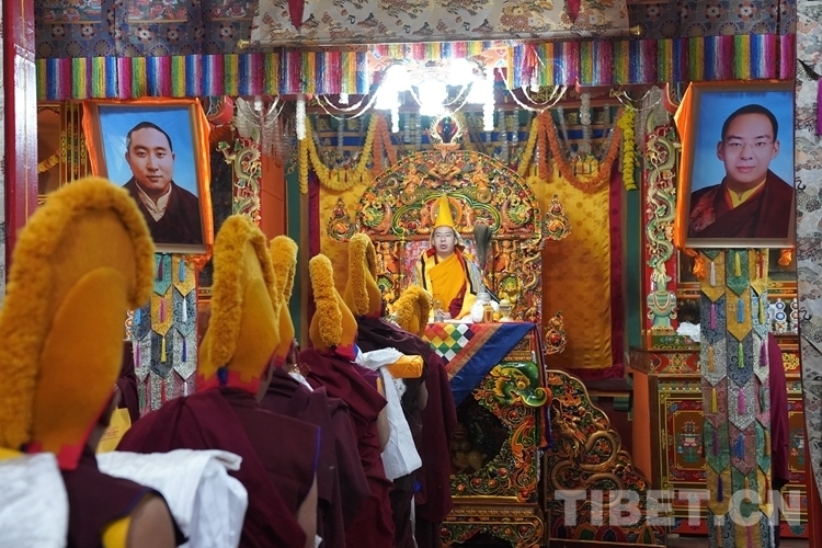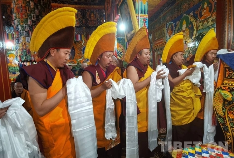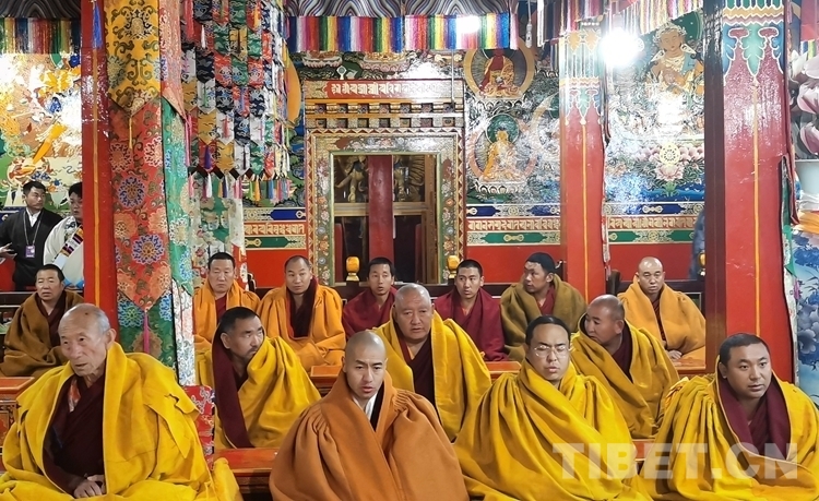 當(dāng)日的拉定寺裝飾一新,班禪一行抵達(dá)后,現(xiàn)場法號齊鳴、法螺合奏,倫珠晉巴和僧眾在寺廟前舉行了隆重的歡迎儀式。隨后,在手持香爐、寶傘高僧的引導(dǎo)護(hù)送下,班禪步入主殿上寶座,向寺廟僧眾傳授《三主要道論》,為僧眾摸頂賜福、發(fā)放布施。