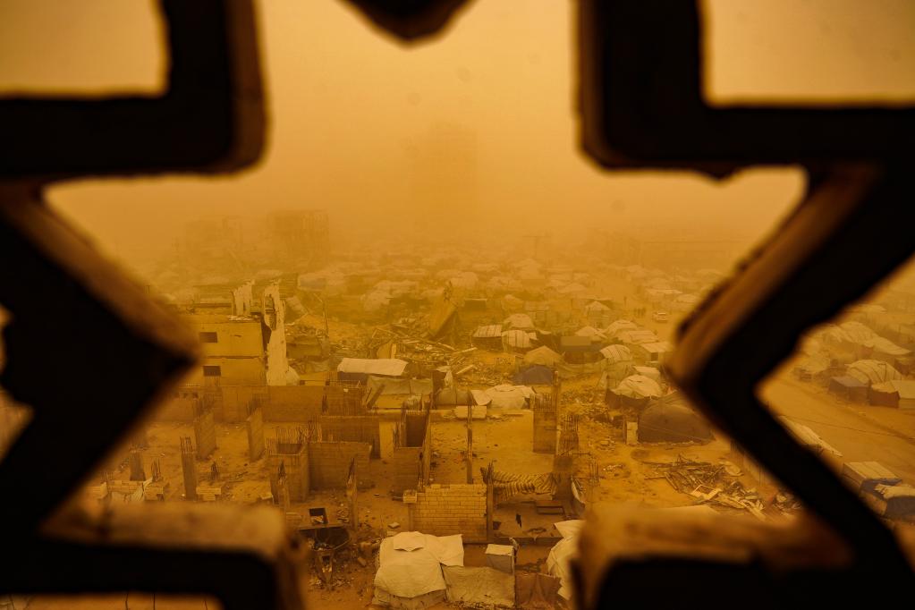 這是3月14日在加沙城拍攝的沙塵天氣中的一處臨時帳篷營地。新華社發(fā)(里澤克·阿卜杜勒賈瓦德攝)