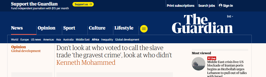 英國(guó)新聞網(wǎng)站《衛(wèi)報(bào)》4月8日刊發(fā)題為《別只看誰(shuí)投票支持將奴隸貿(mào)易定性為“最嚴(yán)重的危害人類(lèi)罪”,要看誰(shuí)沒(méi)有投票》的評(píng)論性文章,作者是肯尼斯·穆罕默德(Kenneth Mohammed),文章摘譯如下: