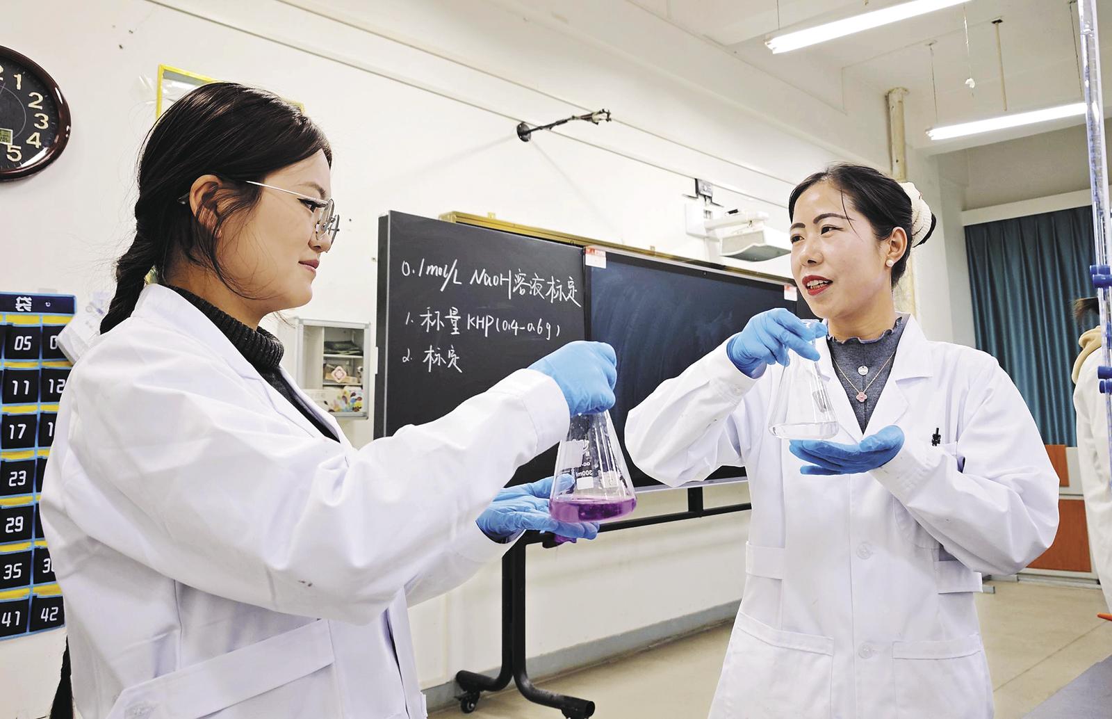 在老師帶領(lǐng)下學習化學分析課程中的氫氧化鈉標定內(nèi)容。