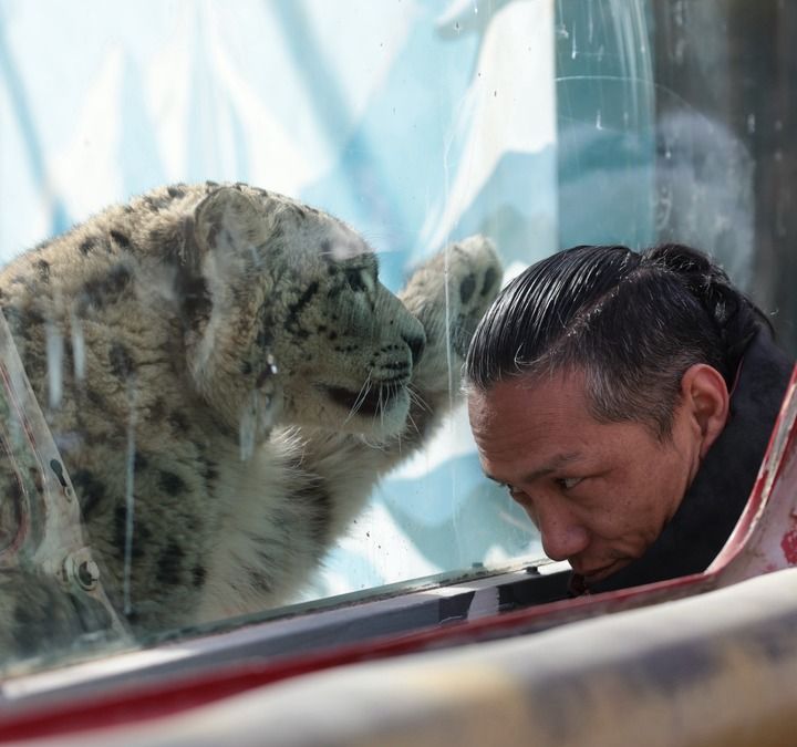 雪豹“凌小蟄”在雪豹館和獸醫(yī)趙海龍隔窗互動(dòng)。新華每日電訊記者 李寧 攝
