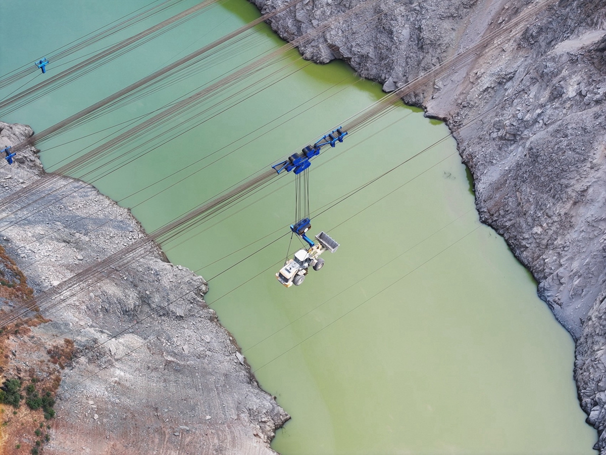 3噸臨時(shí)索道——“微力先行”。早在2023年8月,理塘河特大橋就已搭建起3噸臨時(shí)索道,作為施工前期的“物資擺渡車”,承擔(dān)基礎(chǔ)物料運(yùn)輸任務(wù),將鉆機(jī)、鋼筋、水泥、小型機(jī)具等零散物資精準(zhǔn)運(yùn)抵木里岸,有效解決了“無(wú)路可通”的初始難題。