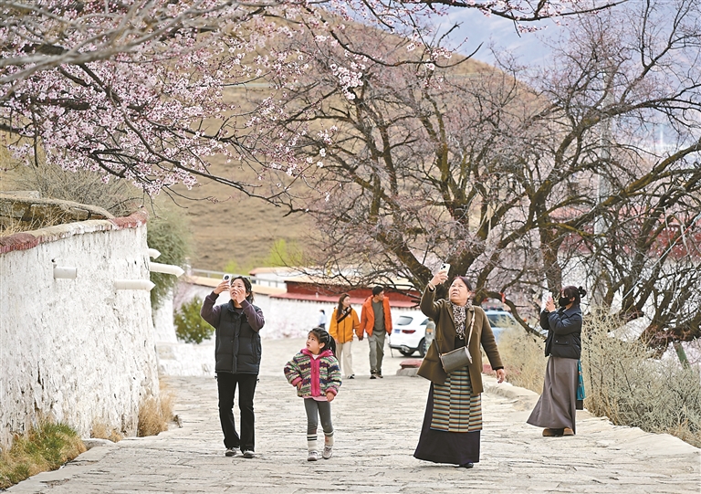 春日的帕邦喀,桃花競相綻放,灼灼芳華鋪滿山間。粉白相間的花海層層疊疊,將古樸建筑掩映其中,勾勒出別樣的詩意畫面。游人漫步花海小徑,或駐足賞花,或拿起相機(jī)定格美景,歡快的笑聲與清幽的花香相互交織,奏響了高原春日里的動(dòng)人樂章。