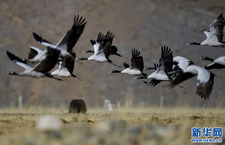 2月17日,西藏拉薩市林周縣黑頸鶴保護區(qū)內(nèi),黑頸鶴翩躚起舞、分外美麗。中新社記者 何蓬磊 攝