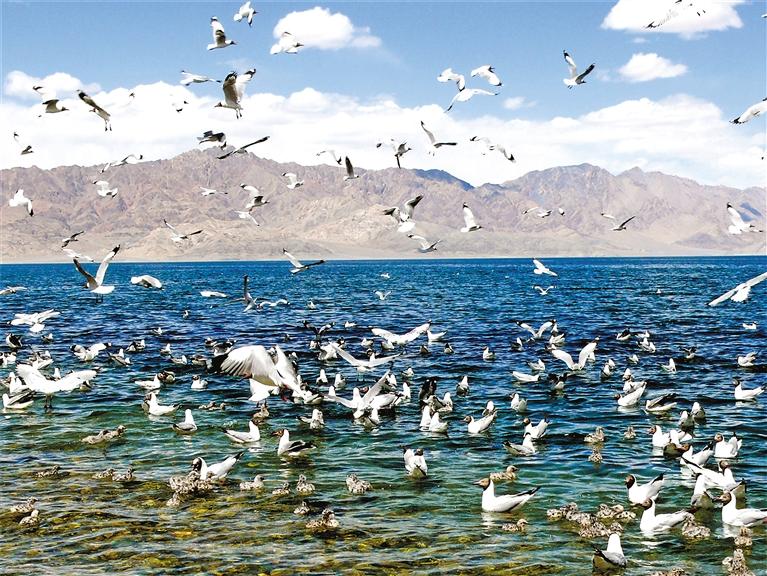 班公湖位于西藏阿里地區(qū)日土縣西部,湖面平均海拔4200米。它的奇特之處在于,由東向西水中含鹽量遞增,湖水在陽光下呈現(xiàn)墨綠、淡綠和深藍等不同的顏色。這里碧波蕩漾,水草豐美,是名副其實的西陲明珠。