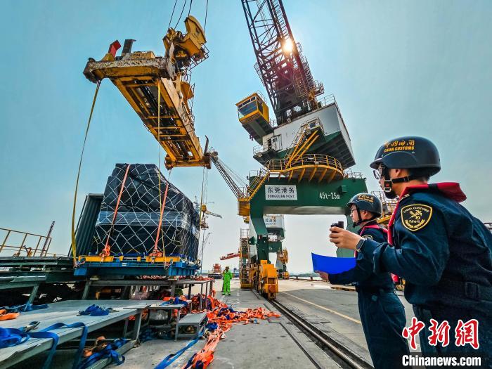 黃埔海關(guān)所屬沙田海關(guān)關(guān)員對經(jīng)“東莞-香港國際空港中心”出口貨物進行監(jiān)管。葉志雄攝
