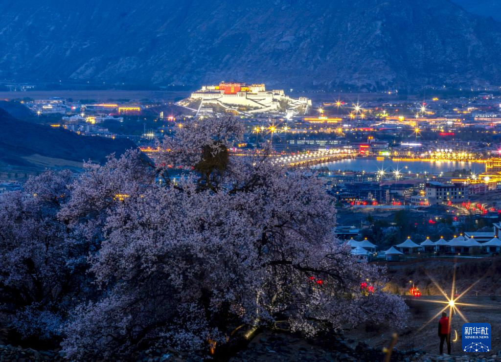 ??夜色中桃花映襯著布達拉宮(4月16日攝)。新華社記者 姜帆 攝