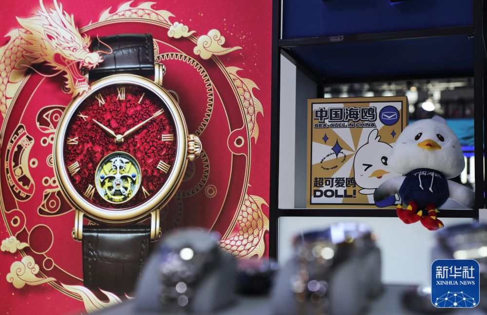 圖為天津館海鷗國潮風格手表展柜。本屆消博會上,“老字號”帶來的國潮新品不僅有著海派文化和傳統(tǒng)文化元素,還與獨具匠心的年輕創(chuàng)意相融合。