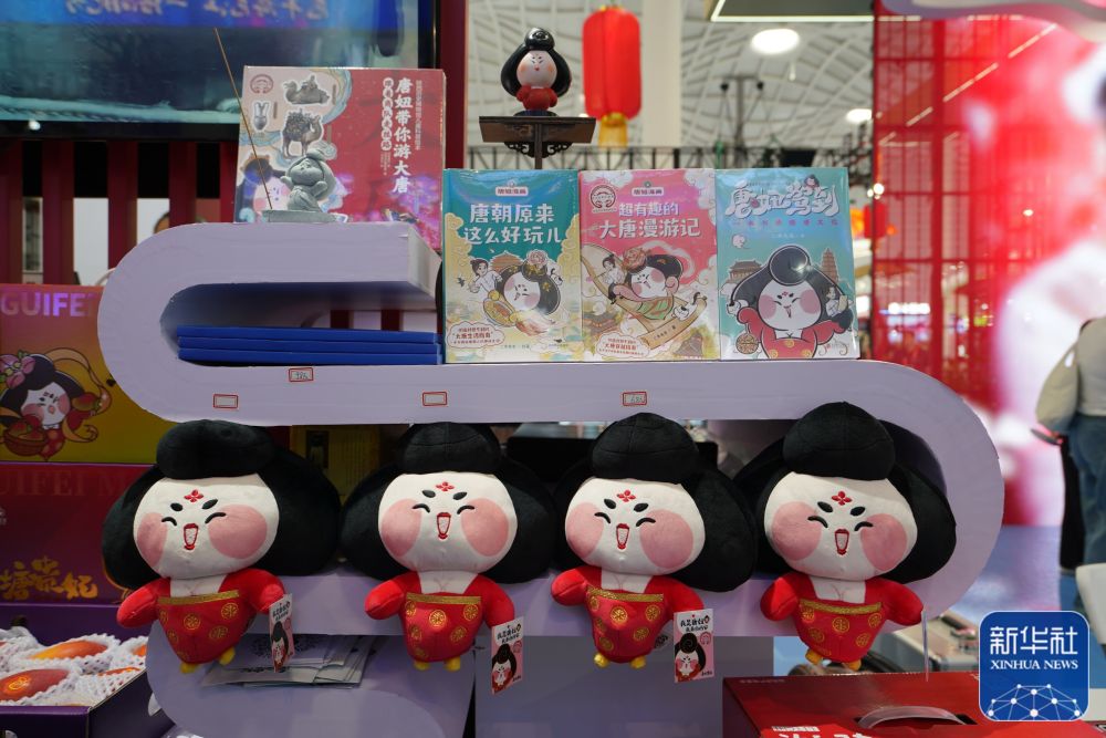 國貨特色潮品展區(qū)陜西展臺展示了“唐妞”系列文創(chuàng)產(chǎn)品?!疤奇ぁ钡目ㄍㄐ蜗笕〔挠陉兾鳉v史博物館館藏文物——唐代彩繪仕女俑。新華社記者楊冠宇 攝
