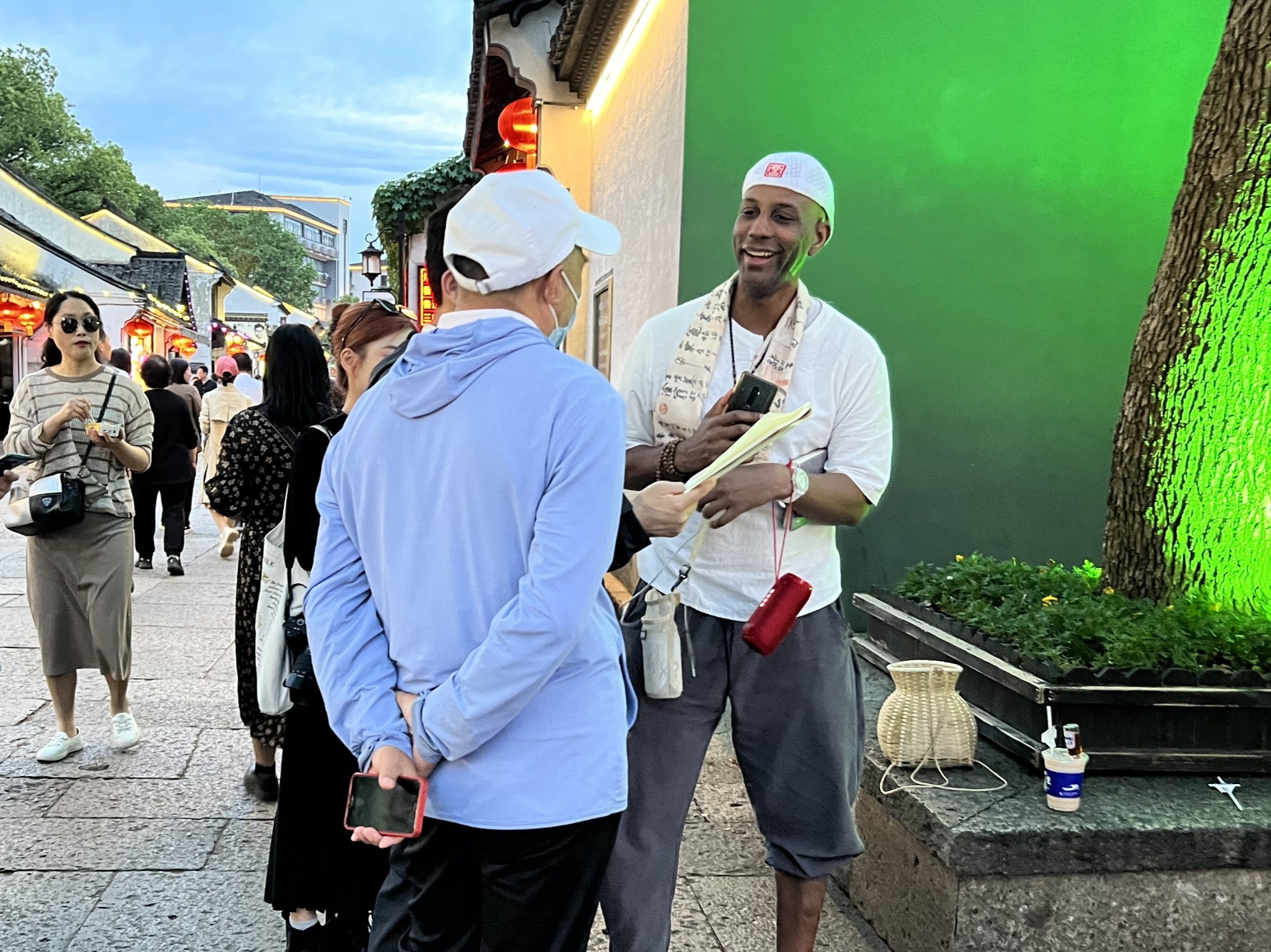 “我叫莊子義,莊周夢蝶之莊,子曰詩云之子,義不屈節(jié)之義?!鼻f子義說,他是美國人,每年都會到浙江紹興來,賞古詩古文,游古鎮(zhèn)古街。在魯迅故里紹興黃酒館門口,他流利地念著門口的對聯(lián)?!皠⒘娼鑶栒l家好,李白還言此處佳?!背酥猓?dāng)場還念起《蘭亭集序》,“群賢畢至,少長咸集。此地有崇山峻嶺,茂林修竹……我一念起古文就剎不住車?!?/p>