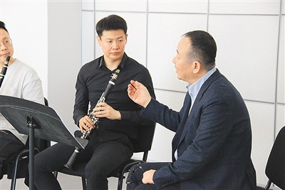 中國交響樂團(tuán)副團(tuán)長、單簧管首席尹波(右一)指導(dǎo)新疆藝術(shù)學(xué)院學(xué)生。