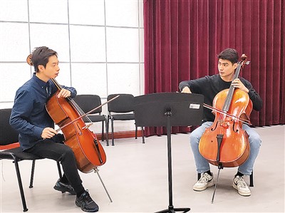 中國交響樂團(tuán)大提琴副首席李成(左)指導(dǎo)新疆藝術(shù)學(xué)院學(xué)生。