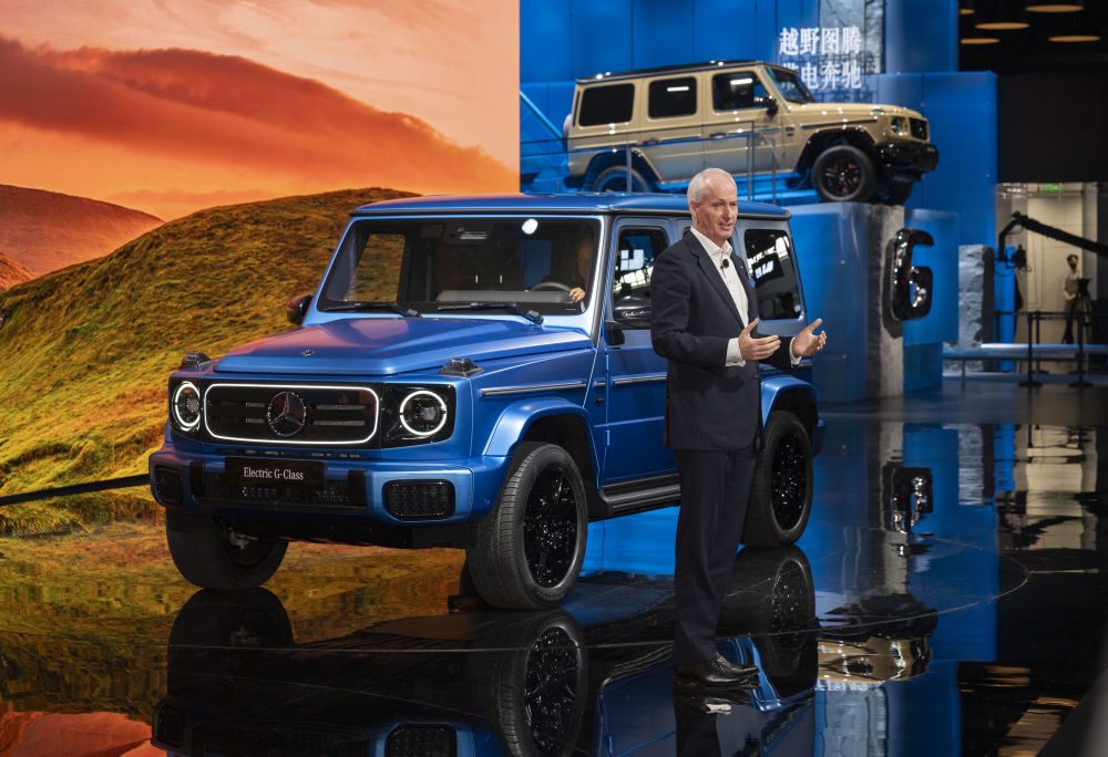 4月25日,在北京中國國際展覽中心順義館舉行的2024北京車展上,梅賽德斯—奔馳集團股份公司董事會成員唐仕凱介紹梅賽德斯—奔馳純電G級越野車。新華社記者才揚攝