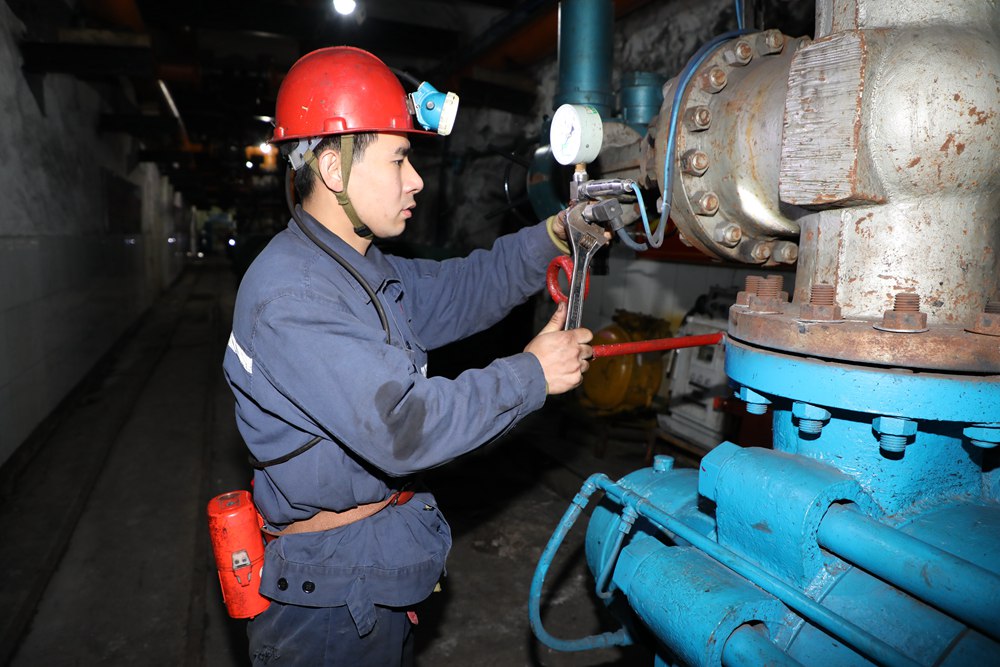2024年4月30日,冀中能源峰峰集團新屯礦機電區(qū)副區(qū)長顧博在井下泵房檢修水泵。新華社發(fā)
