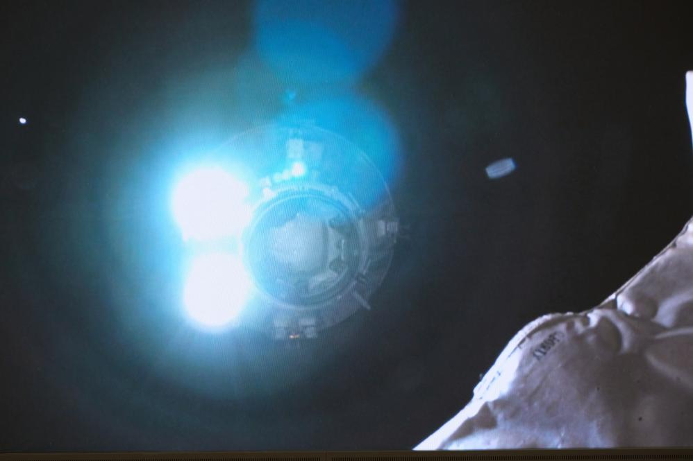 2023年12月21日在北京航天飛行控制中心拍攝的神舟十七號(hào)航天員唐勝杰開展艙外操作的畫面。