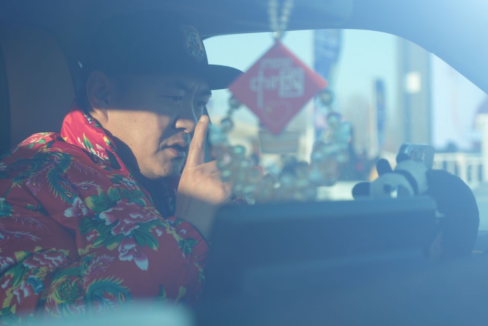 “左右哥”在車內(nèi)接受視頻連線采訪(2024年1月9日攝)。新華社記者 張啟明 攝