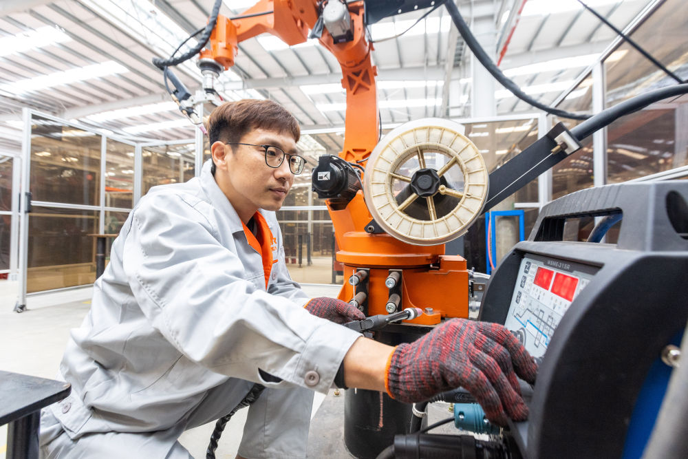 4月23日,在浙江錢江機器人有限公司車間,王洋在調(diào)整電焊機的參數(shù)。新華社發(fā)(溫嶺市委宣傳部供圖)