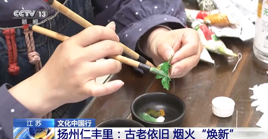 總臺(tái)央視記者 楊威:將傳統(tǒng)的非遺技能進(jìn)行適合現(xiàn)代生活的活化式展現(xiàn),是仁豐里非遺呈現(xiàn)的一大特色。像作為江蘇省級(jí)非遺的揚(yáng)州通草花制作技藝,已經(jīng)有了超過(guò)兩千年的歷史,以前只是專(zhuān)攻于宮廷,如今在這里您可以近距離地觀賞手藝人們現(xiàn)場(chǎng)制作的技巧,也可以親自上手做一個(gè)屬于自己的通草花帶回家。