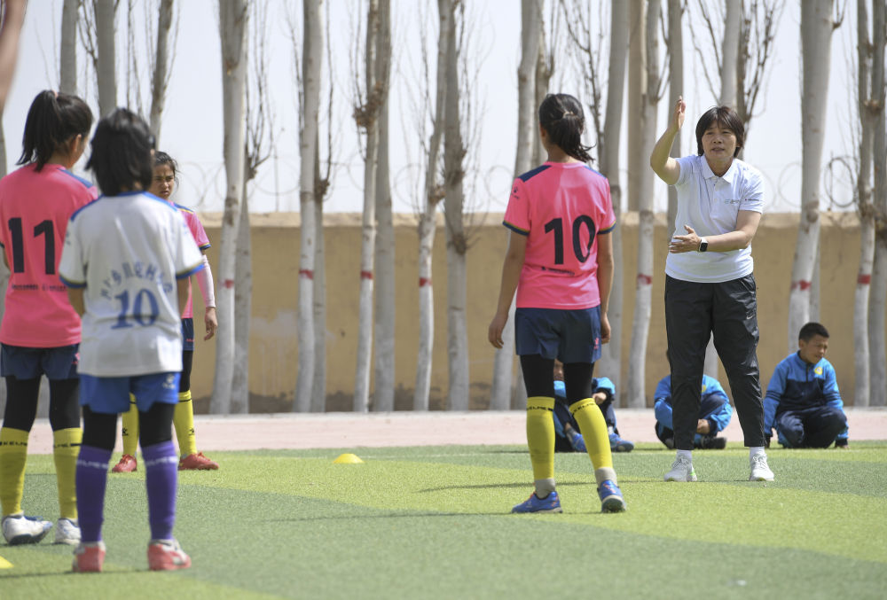 中國女足前主教練水慶霞帶孩子們一起訓(xùn)練。