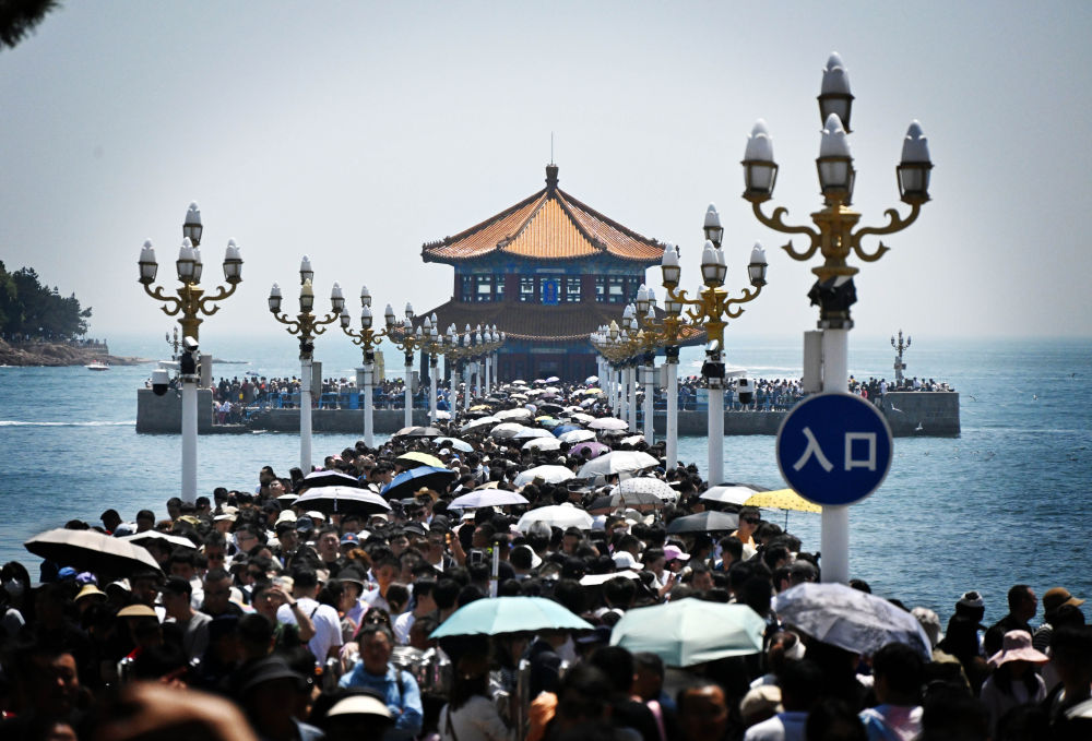 5月2日,游客在青島市棧橋景區(qū)游玩。新華社記者 李紫恒攝