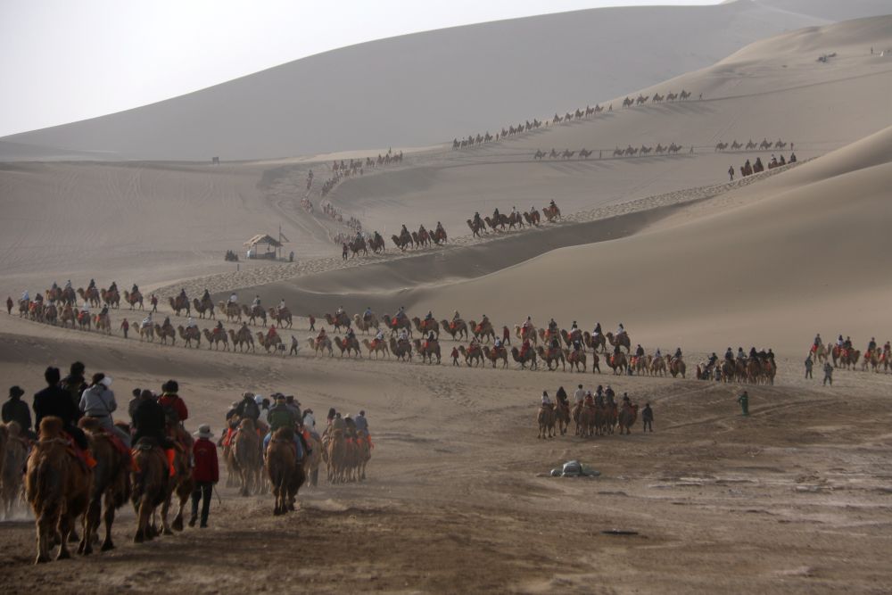 5月4日,游客在甘肅省敦煌市鳴沙山月牙泉景區(qū)游覽。新華社發(fā)(張曉亮攝)