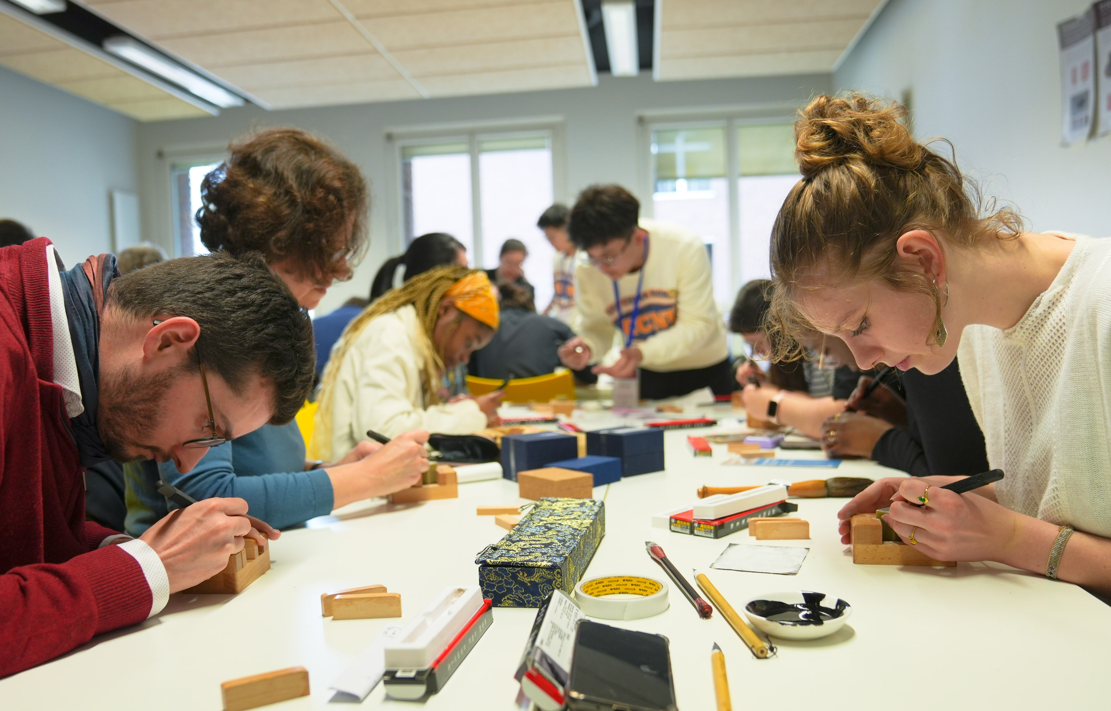 5月2日至5月6日,華東師大“漢字走進(jìn)法國校園”工作坊活動(dòng)在新里昂中法大學(xué)、熱納斯鎮(zhèn)路易·萊普林斯—林蓋中學(xué)、里昂二大與里昂國際學(xué)校相繼舉行。當(dāng)?shù)卮笾行W(xué)生和市民參觀了由華東師大美術(shù)學(xué)院書法篆刻專業(yè)4位老師和43位在校研究生創(chuàng)作的書法篆刻作品,首次動(dòng)手體驗(yàn)了篆刻的樂趣。
