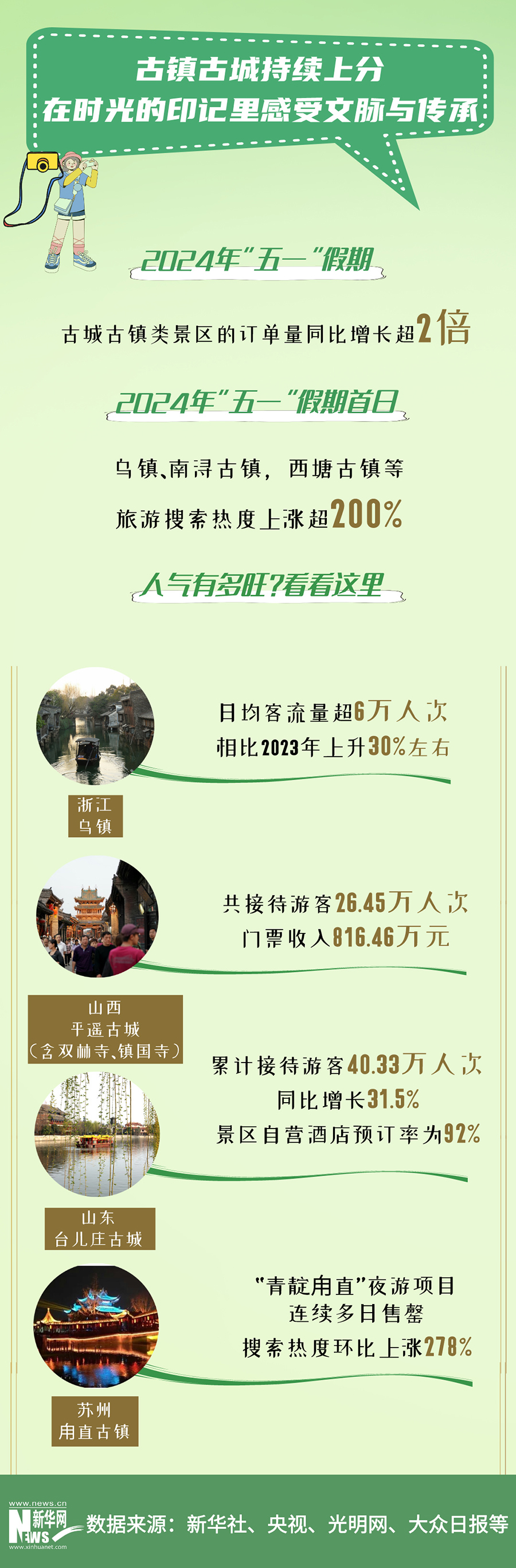 從淄博、哈爾濱到天水,“網(wǎng)紅”城市不斷上新;從桐廬、陽(yáng)朔到義烏,“寶藏”小城頻頻出圈;從烏鎮(zhèn)、麗江再到南潯,古鎮(zhèn)古城持續(xù)上分;從以往人們?cè)延?,到今年五一“每個(gè)城市都彷佛有一億人”......有數(shù)據(jù)、有人氣,文旅市場(chǎng)越來(lái)越活,越來(lái)越“會(huì)玩”。