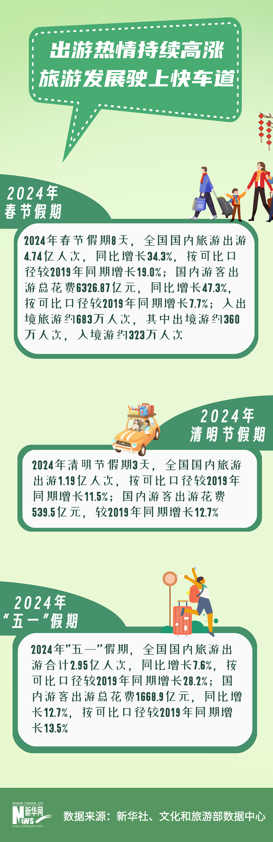 2024年春節(jié)假期8天,全國(guó)國(guó)內(nèi)旅游出游4.74億人次;清明節(jié)假期3天,全國(guó)國(guó)內(nèi)旅游出游1.19億人次;“五一”假期全國(guó)國(guó)內(nèi)旅游出游2.95億人次......
