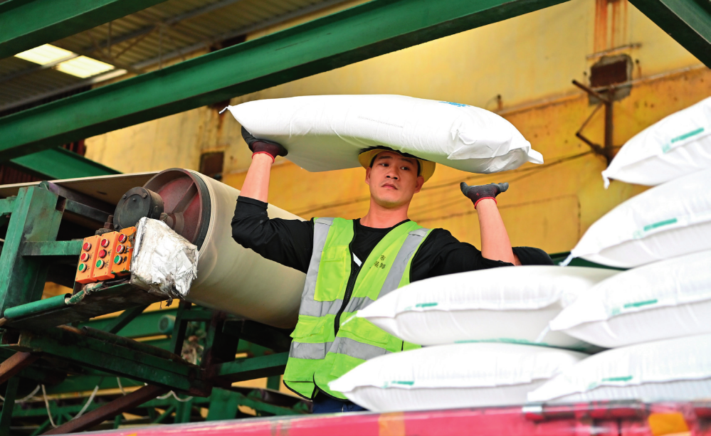 工作人員在廣西來賓小平陽湘桂制糖有限公司將白糖裝車(2023年12月12日攝)周華攝