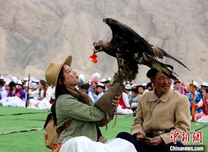 近日,2024年新疆阿合奇縣獵鷹文化旅游季拉開(kāi)帷幕,游客現(xiàn)場(chǎng)與獵鷹互動(dòng)。陶拴科 攝