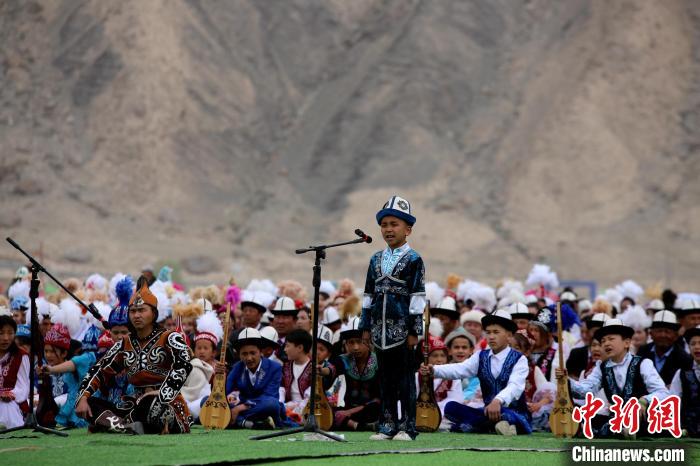 近日,2024年新疆阿合奇縣獵鷹文化旅游季拉開(kāi)帷幕,現(xiàn)場(chǎng)小瑪納斯奇?zhèn)鞒腥藶橛^眾說(shuō)唱《瑪納斯》。陶拴科 攝
