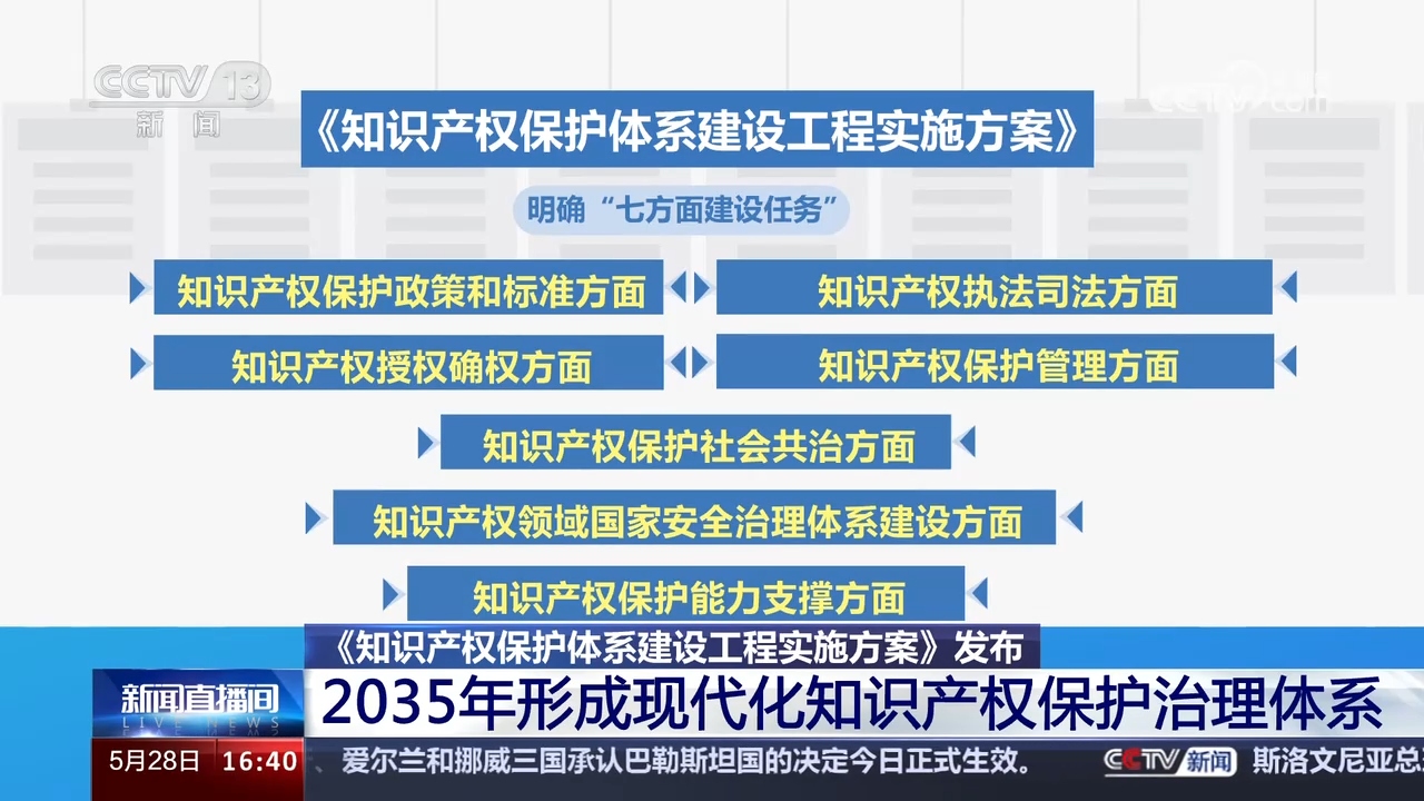 國(guó)家知識(shí)產(chǎn)權(quán)局5月28日舉行新聞發(fā)布會(huì),重點(diǎn)介紹《知識(shí)產(chǎn)權(quán)保護(hù)體系建設(shè)工程實(shí)施方案》(以下簡(jiǎn)稱(chēng)《方案》)有關(guān)情況。《方案》明確,到2035年,知識(shí)產(chǎn)權(quán)保護(hù)體系和保護(hù)能力現(xiàn)代化基本實(shí)現(xiàn),形成政府履職盡責(zé)、執(zhí)法部門(mén)嚴(yán)格監(jiān)管、司法機(jī)關(guān)公正司法、經(jīng)營(yíng)主體規(guī)范管理、行業(yè)組織自律自治、社會(huì)公眾誠(chéng)信守法的現(xiàn)代化知識(shí)產(chǎn)權(quán)保護(hù)治理體系。
