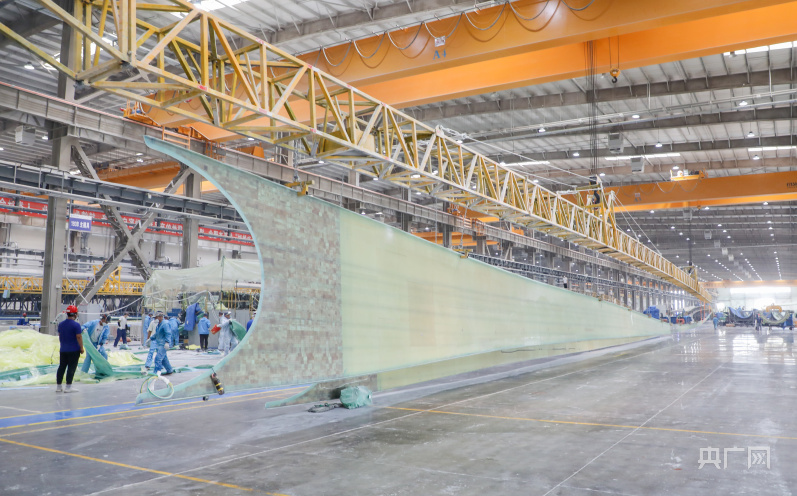 6條百米級及以上葉片生產(chǎn)線上,一個超百米長的“裸裝“風力發(fā)電葉片放置車間中央,靜待技術(shù)人員“美顏”包裝。自主研制的陸上超大型玻纖葉片便是從這里運往沙漠、戈壁、荒漠地區(qū)。