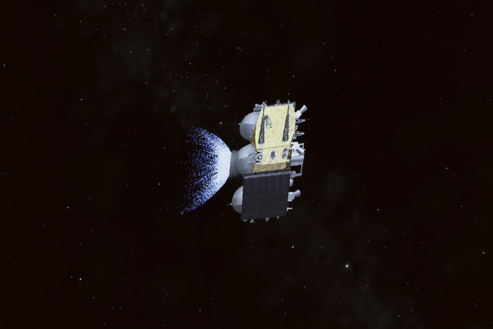 6月4日在北京航天飛行控制中心屏幕上拍攝的嫦娥六號(hào)上升器攜帶月球樣品自月球背面起飛的動(dòng)畫模擬畫面。