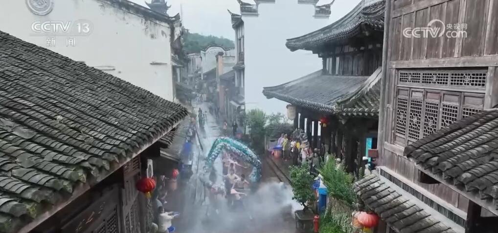 重慶市銅梁區(qū)的安居古城正在進(jìn)行端午節(jié)的非遺文化表演——水云龍。10名赤膊的漢子舞動著一條18米的藍(lán)色水云龍,整條龍上下翻騰、左右騰挪,在兩邊明清時(shí)期的老屋之間穿行。而站在兩旁的居民和游客會拿著水瓢或者水盆,將清水潑向正在舞動的水云龍。雖然水云龍所到之處,大家衣衫都可能打濕,但是大家都樂在其中。