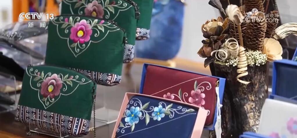 這樣精美的非遺手工藝品,不僅在博物館里能見到,我們?nèi)粘I钜材苡玫蒙稀DF(xiàn)在看到的,就是在楚雄特產(chǎn)店里銷售的成衣、絲巾、背包。這些都是純手工繡出來的。銷售非?;鸨?。)