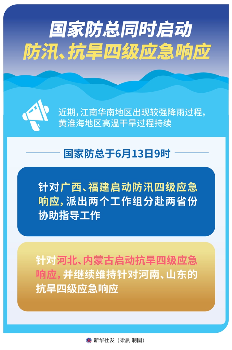 近期,江南華南地區(qū)出現(xiàn)較強降雨過程,黃淮海地區(qū)高溫干旱過程持續(xù)。國家防總于6月13日9時針對廣西、福建啟動防汛四級應(yīng)急響應(yīng),派出兩個工作組分赴兩省份協(xié)助指導(dǎo)工作;針對河北、內(nèi)蒙古啟動抗旱四級應(yīng)急響應(yīng),并繼續(xù)維持針對河南、山東的抗旱四級應(yīng)急響應(yīng)。